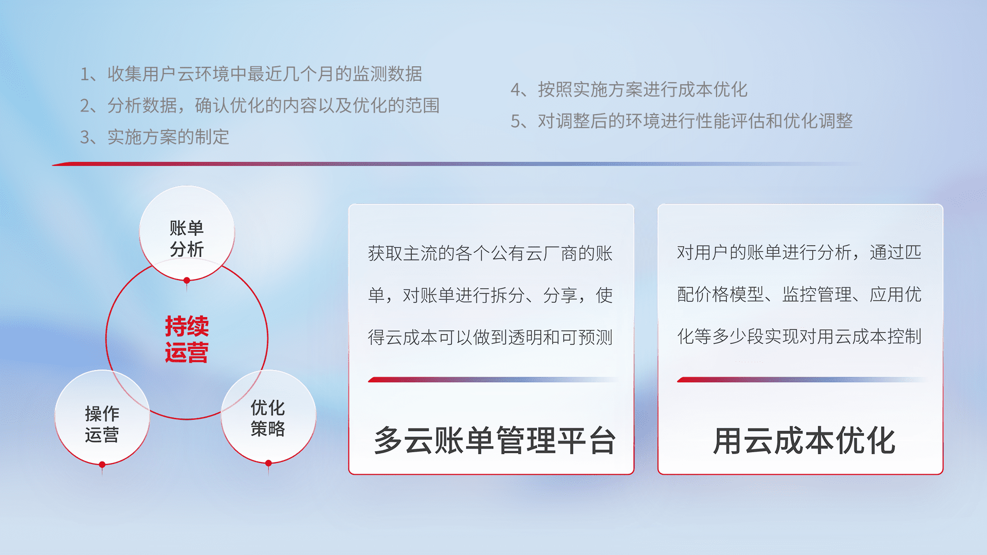 通过多云纳管,,,,以统一的资源数据模型把客户的云资源进行抽象和封装,,,进而实现对多云资源的统一操作,,,保障云资源管理的可靠性、、、稳定性与可用性。。量身定制化运维内容,,,,配置、、开发运维、、、、补丁管理、、、备份、、监控、、、认证和访问管理、、审计和日常巡检等,,,,保障在用云过程中的可靠度,,稳定度以及高可用率。。。